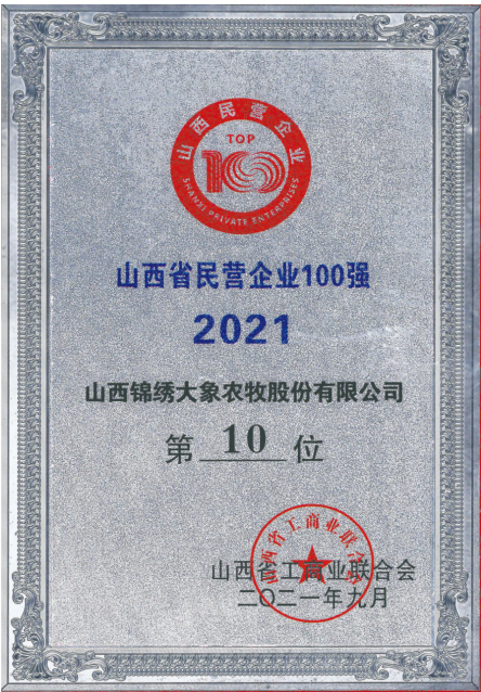本次在2021山西省民營(yíng)企業(yè)100強(qiáng)中排名第十,是公司自2018年(第十名)、2020年(第九名)后第三次進(jìn)入全省民營(yíng)企業(yè)百?gòu)?qiáng)榜單前十名,是對(duì)數(shù)萬(wàn)名“大象人”默默奉獻(xiàn)、愛(ài)崗敬業(yè)、苦干實(shí)干的激勵(lì),充分證明了董事會(huì)及高層經(jīng)營(yíng)管理團(tuán)隊(duì)決策的正確性。未來(lái),公司將緊緊依托省委全方位推進(jìn)高質(zhì)量發(fā)展和特優(yōu)戰(zhàn)略的政策利好,繼續(xù)扛起引領(lǐng)全省畜牧業(yè)發(fā)展的重任,圍繞補(bǔ)鏈延鏈強(qiáng)鏈,不斷優(yōu)化產(chǎn)業(yè)布局,切實(shí)保障好產(chǎn)品供應(yīng),為守護(hù)三晉父老“菜籃子”安全穩(wěn)定做出更大貢獻(xiàn)。
