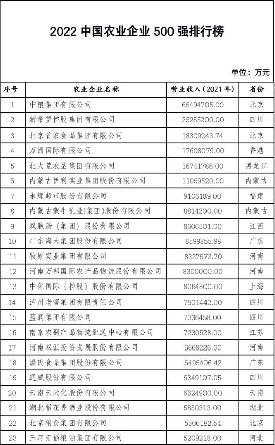 據(jù)悉,《2022中國(guó)農(nóng)業(yè)企業(yè)500強(qiáng)》名單全面、客觀、系統(tǒng)展現(xiàn)了我國(guó)農(nóng)業(yè)企業(yè)發(fā)展情況,是較為權(quán)威的官方排名?;顒?dòng)參照國(guó)際通行評(píng)價(jià)辦法,由企業(yè)按照要求進(jìn)行申報(bào)或采用公開(kāi)數(shù)據(jù),參考利潤(rùn)和企業(yè)信譽(yù)等數(shù)據(jù),經(jīng)信息匯集、嚴(yán)格審核、專家評(píng)議等程序,依據(jù)2021年農(nóng)業(yè)企業(yè)營(yíng)業(yè)收入排序產(chǎn)生。